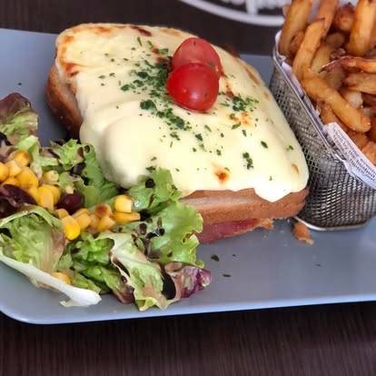croque monsieur , œuf au plat , saucisse de Strasbourg , frites salades