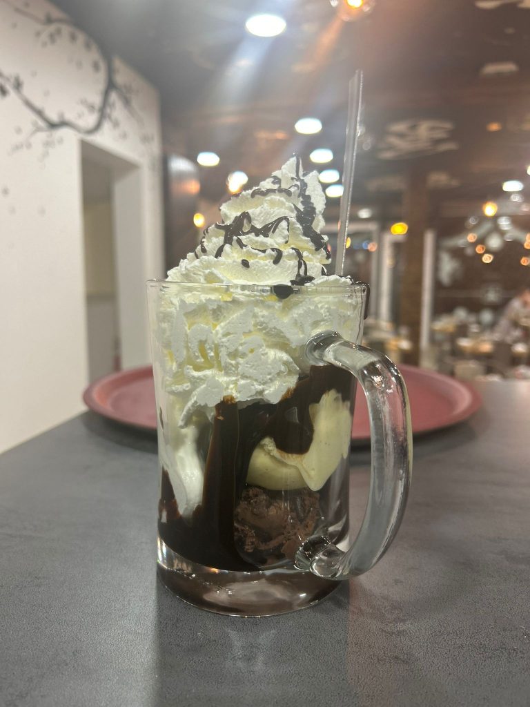 parfum de glace au choix , boule de glace vanille, coulis de chocolat, crème sucrée