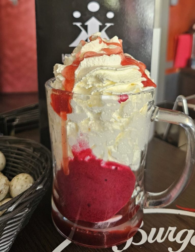 glace barbe à papa, glace vanille, sorbet framboise, coulis fruits rouges, crème sucrée, marshmallow