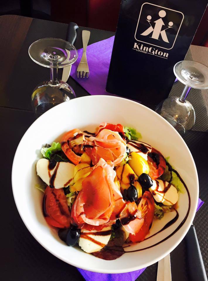 pain bruchetta, jambon sec, tomates, Pesto, Mozzarella, frites maison, salade